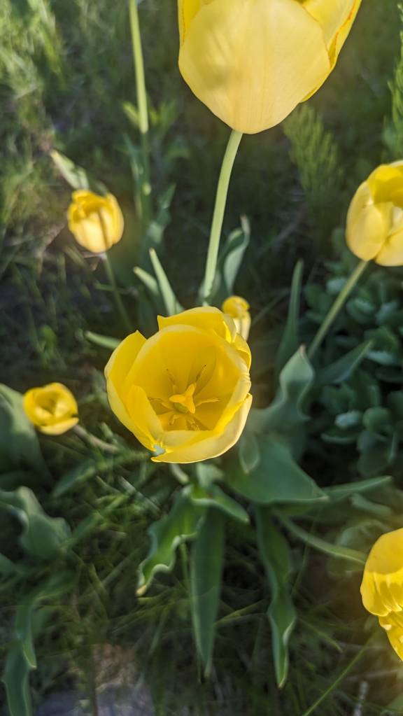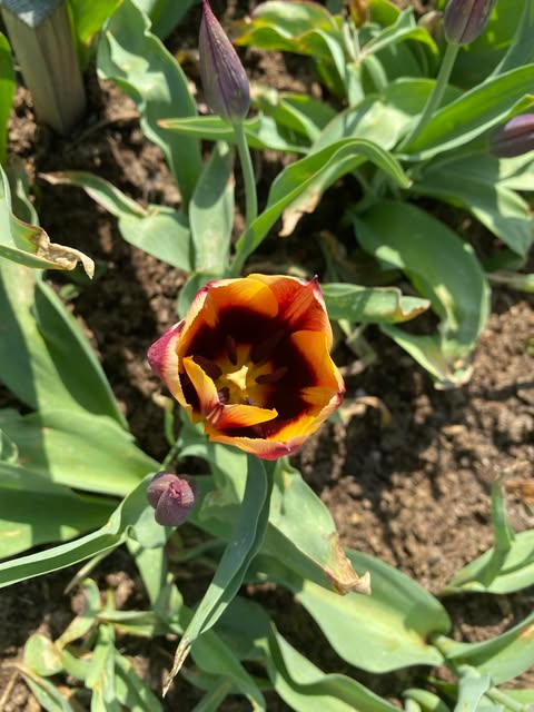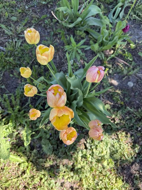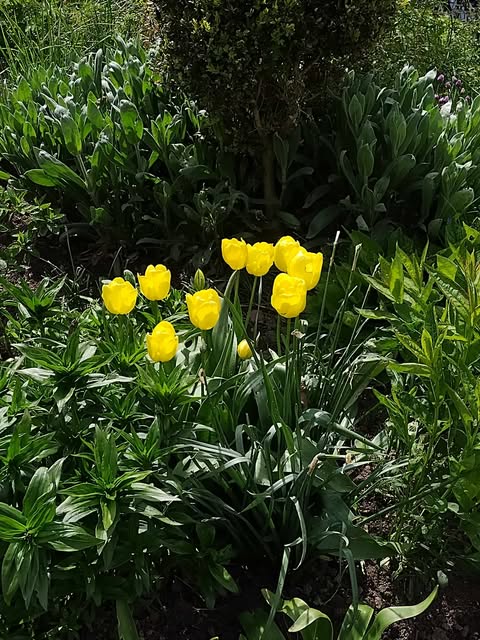 Vėlyvos tulpės. Žiedai geltoni, su amžiumi žiedlapiai smarkiau parausta. Dugnas geltonas.