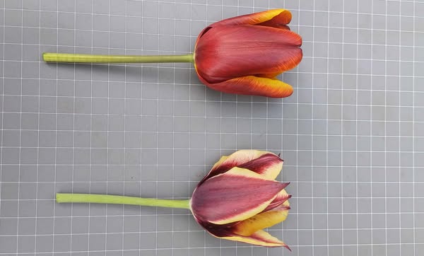 Vėlyvos gelsvos tulpės. Žiedlapiai nusmailėję. Žydėjimo pradžioje žiedlapiai gelsvi su vos vos matomu raudonu pakraštėliu, su amžiumi jis plečiasi ir žiedlapis nusidažo rausvai.