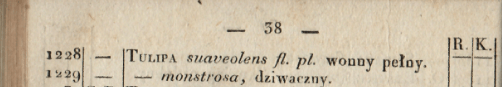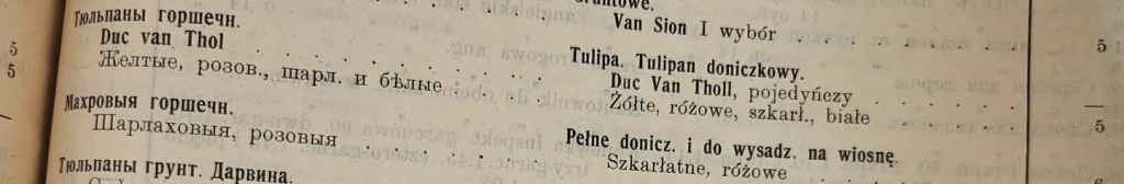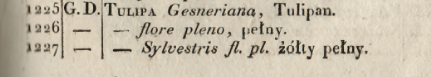 J. Strumila 1822 m. Vilniaus medelyno kataloge mini šias tulpes: Tulipa Gesneriana flore pleno/pelny; Tulipa Gesneriana sylvestris fl.pl./zolty pelny; Tulipa suaveolens flora plena/wonny pelny; Tulipa monstrosa/dziwaczny.